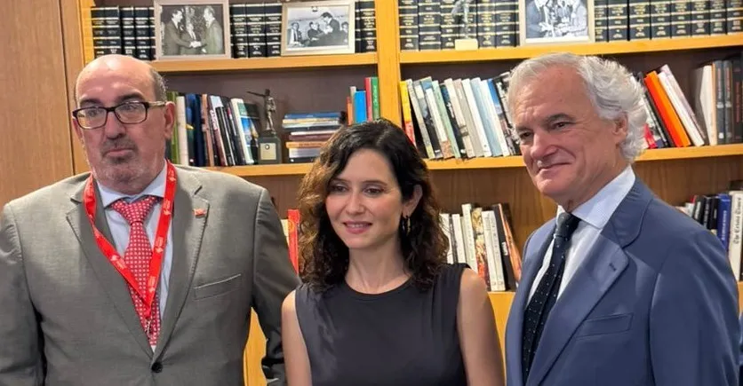 Juan Mateos Rivera, presidente de A.E.S.A., departiendo con Isabel Días Ayuso y Miguel Garrido de la Cierva